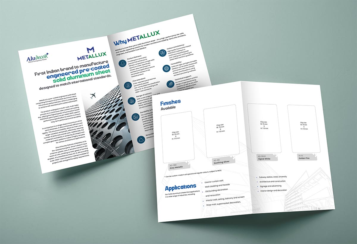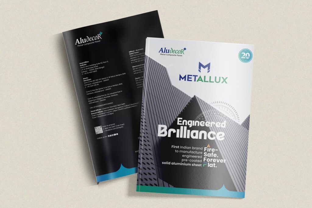 The first catalogue introduces Metallux, an engineered pre-coated solid aluminium sheet, which will be introduced in India for the first time. Through a clean, impactful design, we showcase the full product details with engaging images and production specifications.